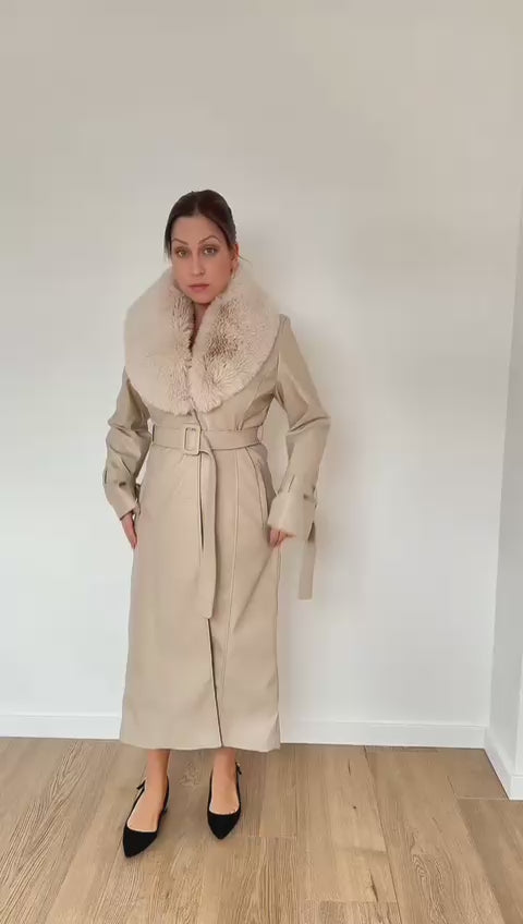 CASACO COMPRIDO BEGE COM GOLA DE PÊLO