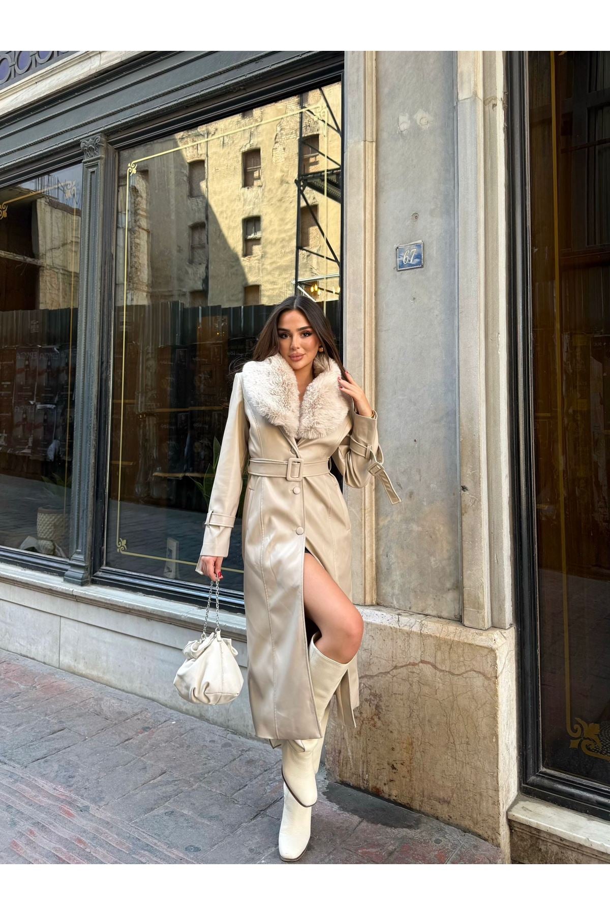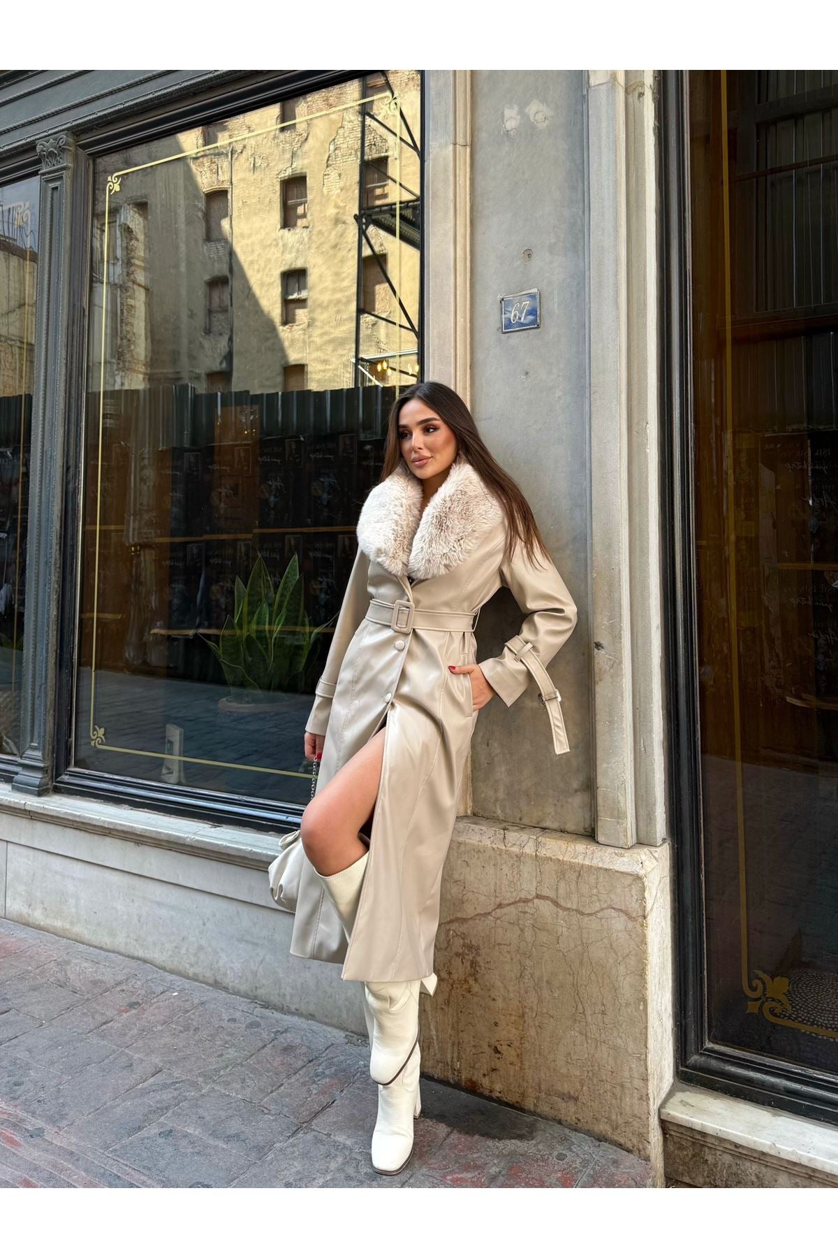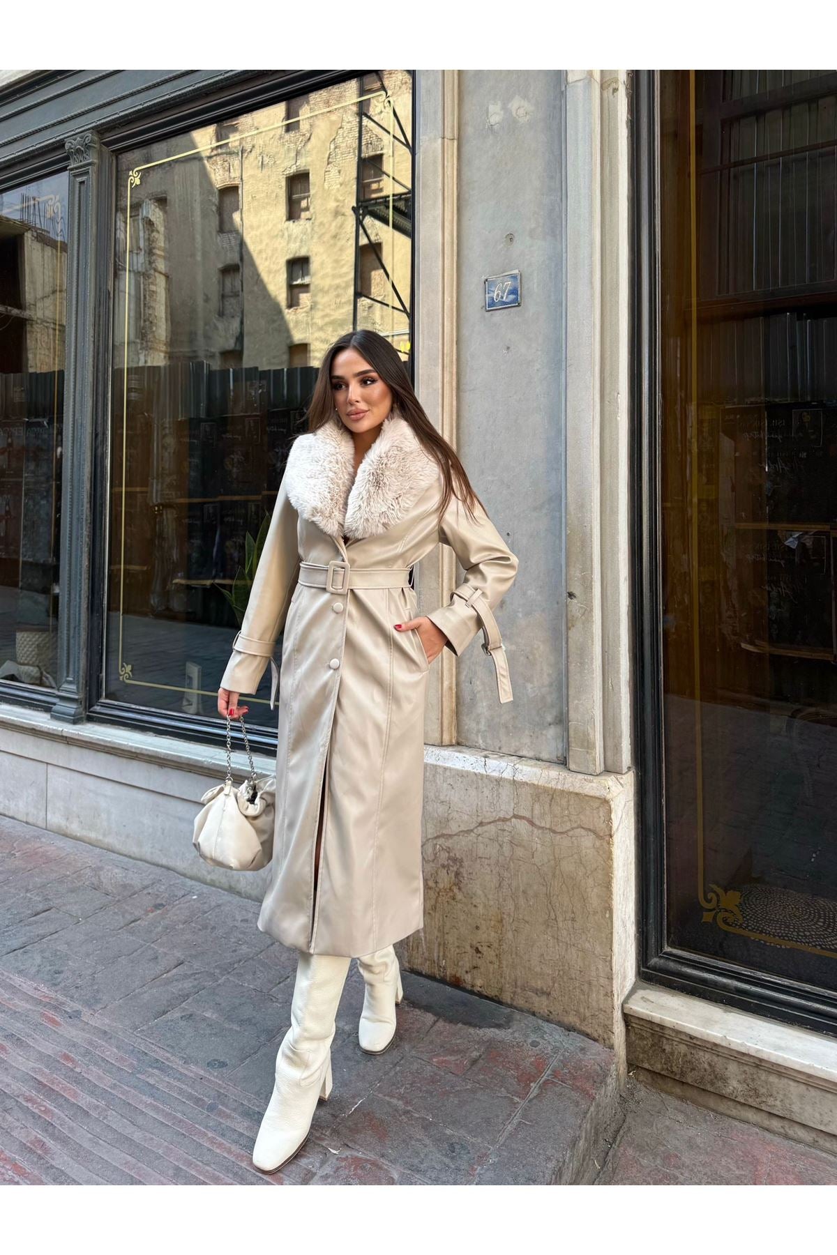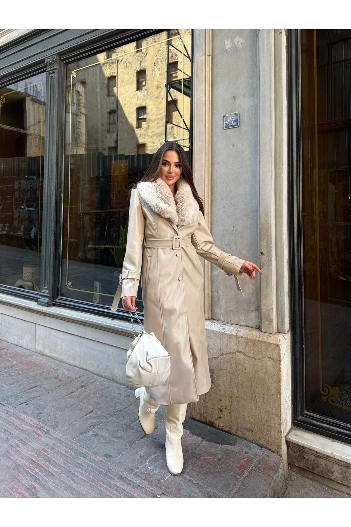 Luxo, conforto e elegância numa única peça! O casaco comprido bege com gola em pêlo é indispensável no guarda-roupa feminino, oferecendo sofisticação e conforto nos dias frios sem perder o estilo.