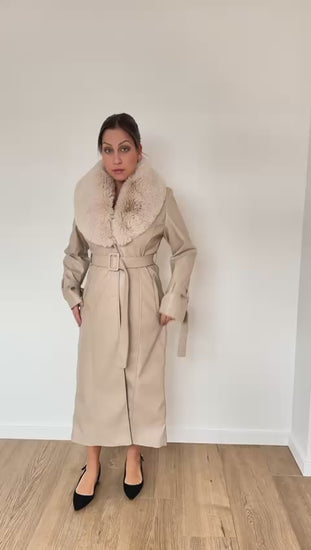 A gola em pêlo traz um toque de requinte e aconchego, enquanto o corte alongado valoriza a silhueta e adiciona imponência ao visual. Com design clássico e cor neutra, este casaco é extremamente versátil — ideal para compor looks elegantes com vestidos, calças ou conjuntos de alfaiataria.