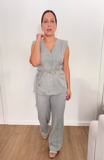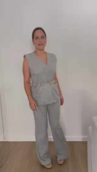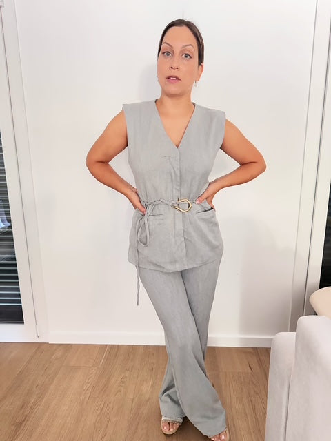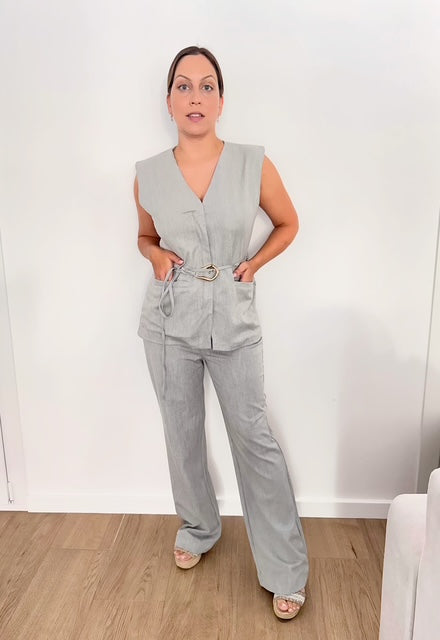 "Conjunto cinzento com blusa sem mangas, com bolsos e cinto dourado. Elegância, versatilidade e poder numa peça perfeita para negócios e eventos."