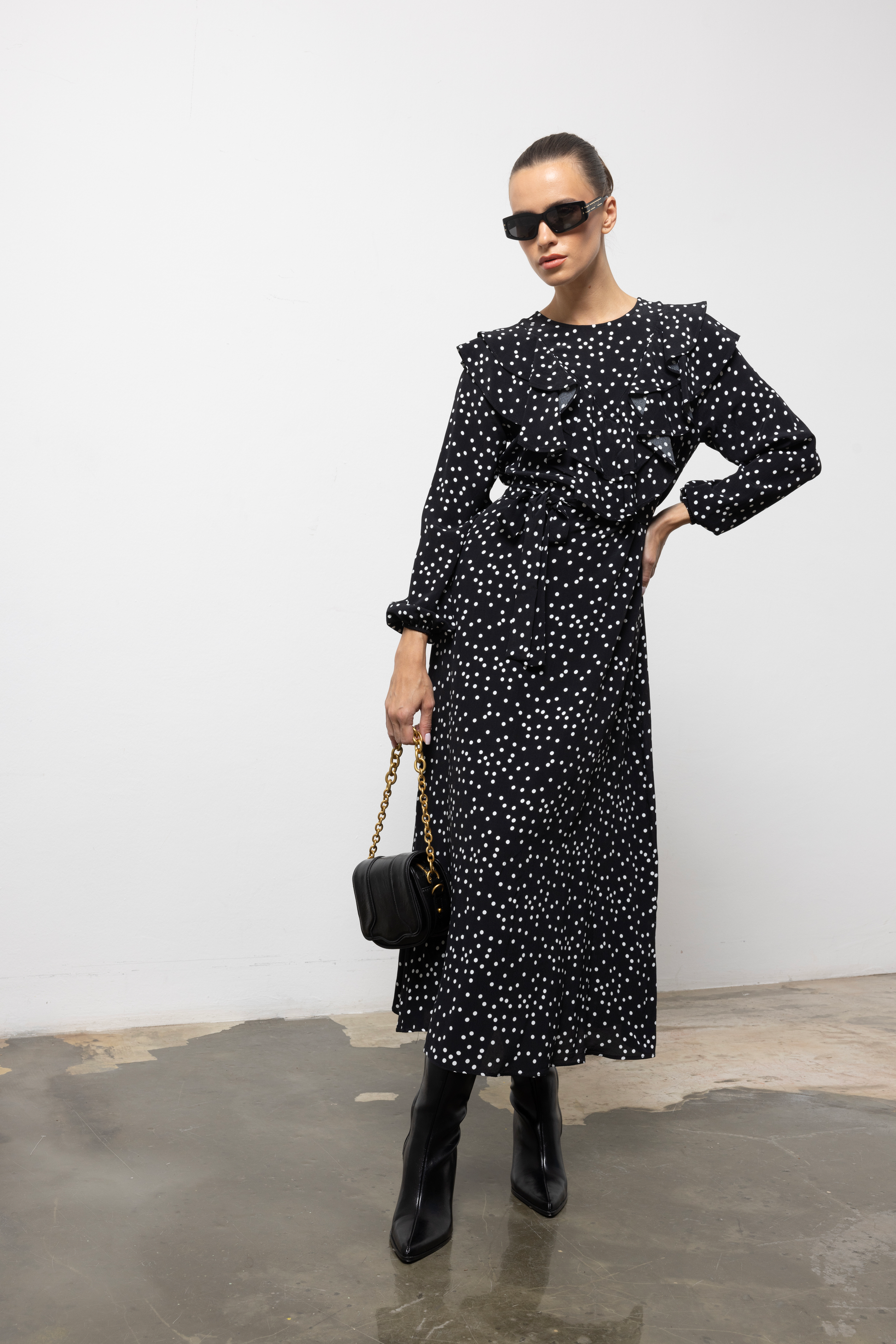 Clássico, feminino e atemporal — o vestido preto com bolinhas brancas é a peça essencial para quem deseja unir elegância, conforto e versatilidade num único look!